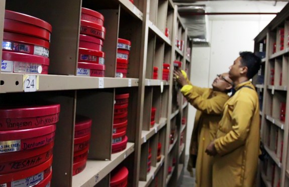 Dua orang petugas saat mencari master roll film dokumentasi deklarasi Konferensi Asia Afrika 1955 di gedung penyimpanan Arsip Nasional Republik Indonesia (ANRI), Jakarta, Kamis (29/10). ANRI mendaftarkan arsip Konferensi Asia Afrika (KAA) sebagai salah satu warisan ingatan dunia ke Lembaga PBB, Unesco. Sebanyak 565 arsip berupa foto dan tujuh arsip berupa film sudah dikirimkan ke Unesco. Dery Ridwansah/RM