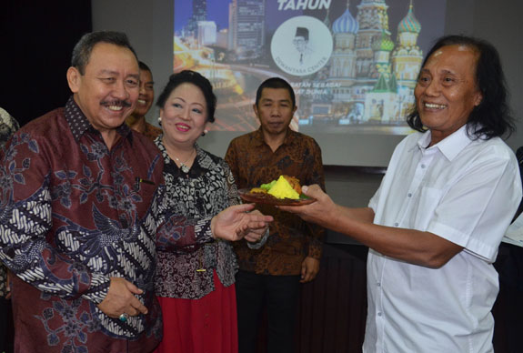 Ketua Umum Dewantara Center, Syahnagra Ismail (kemeja putih) bersama Ketua Dewan Pembina Jenderal (purn) Tyasno Sudarto (kiri) dan para pengurus saat perayaaan satu tahun yayasan Dewan Center di Pusat Kebudayaan Rusia, Jakarta Jumat (30/10). Acara diselenggarakan guna meneruskan semangat tokoh pendidikan nasional Ki Hajar Dewantara dengan mengembangkan kebudayaan sebagai landasan persatuan dalam kehidupan berbangsa dan bernegara. Indra Hardi/RM
