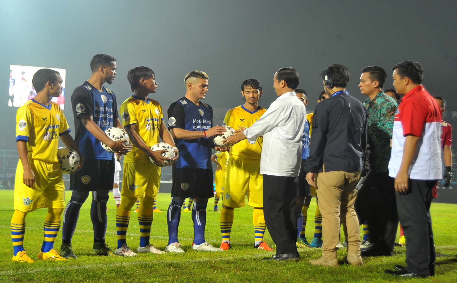Presiden Joko Widodo didampingi Menteri Pemuda dan Olahraga, Imam Nahrawi menghadiri acara pembukaan atau kick off pertandingan pertama antara Arema Cronus vs Persegres Gresik di ajang Turnamen Piala Jendral Sudirman 2015 di Stadion Kanjuruhan, Malang, Jawa Timur, Selasa (10/11) malam.
