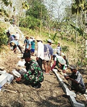 Sedikitnya ada 9 personil anggota Koramil 07/Sambong terjun ke lapangan membantu warga setempat pasang paving sepanjang 200 meter dengan lebar 2,5 meter.