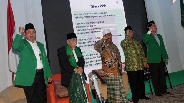 Ketua Majelis Syariah Partai Persatuan Pembangunan KH Maimun Zubair, Ketua Umum Djan Faridz dan jajaran pengurus pusat DPP PPP saat pembukaan acara silaturahmi nasional wakil rakyat dari PPP mulai dari DPR, DPRD 1, dan DPRD 2 dari seluruh Indonesia di Jakarta, Minggu (22/11). Indra Hardi/RM