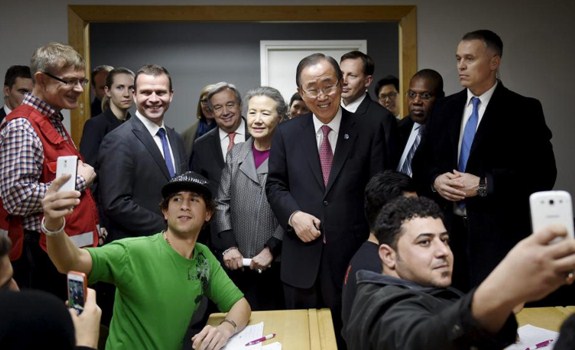 Sejumlah orang mengambil foto selfie saat Sekjen PBB berkunjung ke pusat penerimaan pencari suaka di Vantaa, Finlandia (Kamis, 9/12). Kunjungannya ke Finlandia dilakukan untuk merayakan ulang tahun ke-60 dari keanggotaan Finlandia di PBB. Reuters