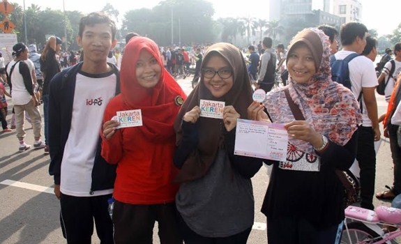 Sejumlah warga menunjukan stiker #JakartaKEREN saat hari bebas kendaraan bermotor di kawasan Bundaran hotel Indonesia, Jakarta, Minggu (10/1). Dalam kesempatan itu, komunitas #JakartaKEREN menggelar sosialisasi kepada masyarakat untuk meminta pandangan dan menyerap aspirasi masyarakat Jakarta. Indra Hardi/RM