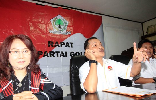 Joeslin Nasution (tengah) yang mengklaim sebagai Pelaksana tugas (Plt) Ketua Umum Partai Golkar menggelar jumpa pers di Kantor MKGR, Jalan Diponegoro, Jakarta Pusat, Rabu (27/1). Joeslin menyatakan kepengurusan Plt Partai Golkar yang ia pelopori dan para pendiri Golkar, akan mengisi kekosongan pengurus Partai Golkar. Dwi Pambudo/RM