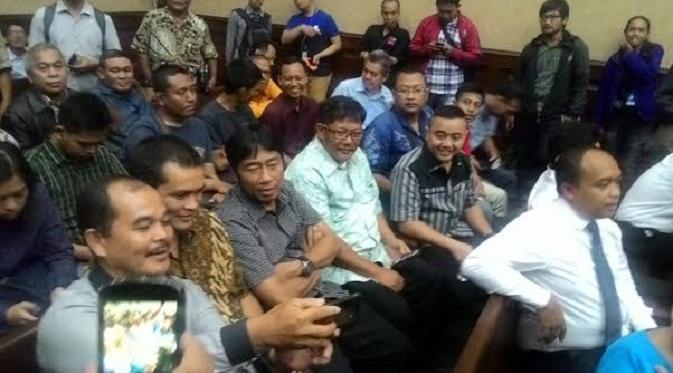 Wakil Ketua DPRD DKI Jakarta, Abraham Lunggana, tampak duduk bersama rekan-rekannya menyaksikan Gubernur DKI Jakarta, Basuki Tjahaja Purnama, memberikan kesaksian di pengadilan Tindak Pidana Korupsi (Tipikor) Jakarta.
