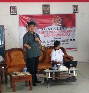 "Kalau kita paham Pancasila, kita juga tentu paham bahwa LGBT tidak pantas hidup di Indonesia. Jika berdasarkan sila pertama Pancasila, tidak ada satu agamapun yang membenarkan perilaku LGBT, kata Anggota MPR RI dari Dapil Lampung, Juniadi Auly saat sosialisasi Empar Pilar Kebangsaan di Kabupaten Tulangbawang, Lampung, Jumat (19/2).
