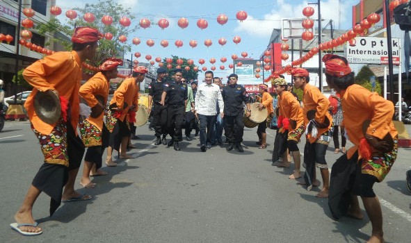 Menpora Imam Nahrawi (kemeja putih) disambut tari dan kesenian daerah saat tiba di Lombok untuk menghadiri seminar kebangsaan dan pelantikan pengurus Garda Pemuda Nasdem NTB di Lombok Plaza Hotel, Minggu (21/1). Seminar mengangkat tema revolusi mental sebagai upaya menangkal radikalisme menuju Indonesia yang berkepribadian.Repro
