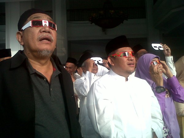 Gubernur Jawa Barat Ahmad Heryawan (tengah) bersama wakilnya Deddy Mizwar (kiri) mengenakan kacamata khusus menyaksikan Gerhana Matahari Total (GMT) 2016 dari Gedung Sate, Bandung, Jabar, Rabu (9/3). Di Kota Bandung sendiri hanya terjadi Gerhana Matahari Sebagian (GMS). Gerhana mulai 06.19 WIB; puncak gerhana 07.21 WIB; gerhana berakhir; 08.32 WIB; dan lama gerhana 2 jam 12 menit. Repro
