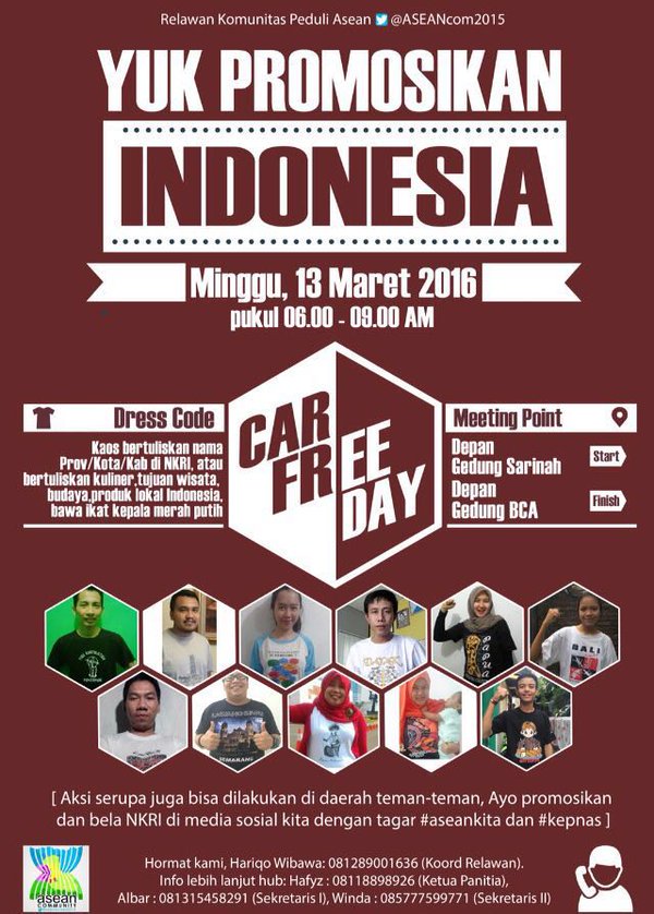Relawan Komunitas Peduli ASEAN pun mengajak warga yang datang untuk menggunakan kaos bertuliskan nama provinsi, kota atau kabupaten di NKRI, atau kaos bertuliskan tujuan wisata, kuliner, budaya serta produk lokal Indonesia. Peserta pun diminta menggunakan ikat kepala merah putih.