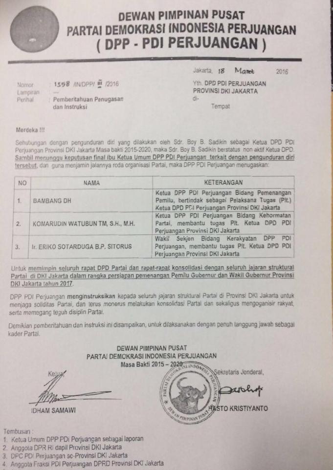 Dalam surat yang ditandatangani Idham Samawi (Ketua) dan Hasto Kristiyanto (Sekjen), ketiganya diminta memimpin seluruh rapat DPD dan rapat-rapat konsolidasi dengan seluruh jajaran struktural partai di DKI Jakarta dalam rangka persiapan pemenangan Pilgub DKI Jakarta 2017.