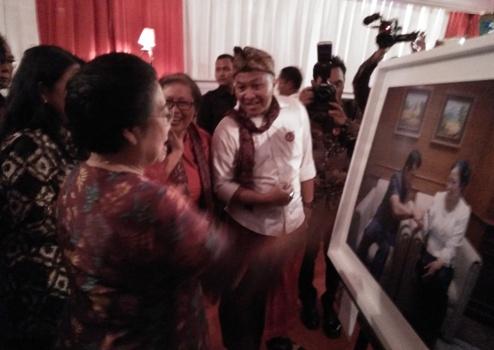 Ketua Umum DPP Partai Demokrasi Indonesia Perjuangan Megawati Soekarnoputri memandangi foto kenangan saat mendeklarasikan diri sebagai Ketua Umum PDI bertemu dengan Mendagri Yogie S Memet di masa Orba sekitar tahun 1995. Saat itu, pemerintah tak menghendaki Megawati menjadi Ketua Umum Parpol. Dalam Pemilu 1999, Pemilu di era masa reformasi, Parpol yang dipimpin Megawati memenangi Pemilu dan pada 2001, Megawati menjadi presiden kelima RI.Feril Nawali/RMOL