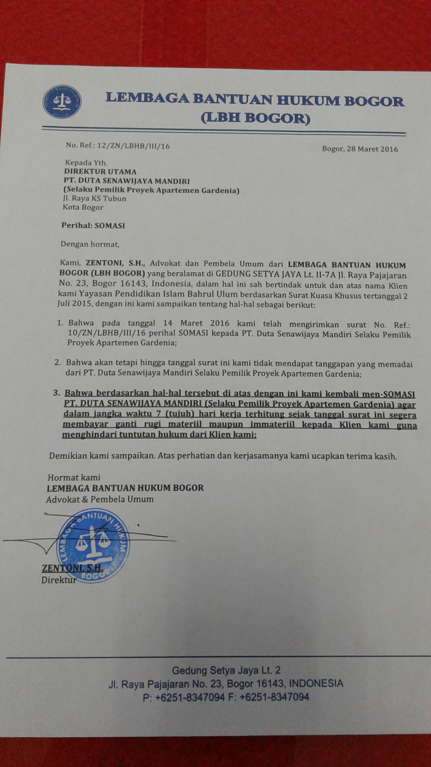 Selain itu, pihaknya juga melayangkan somasi kedua kepada PT Duta Senawijaya Mandiri selaku pemilik proyek apartemen Gardenia Bogor. Somasi dilayangkan karena sampai batas waktu yang ditentukan sejak somasi pertama dilayangkan pada 14 Maret 2016, pihak Duta Senawijaya tidak memberikan tanggapan yang memadai.