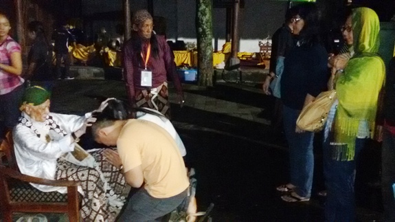 Umat Katolik dari berbagai daerah di Indonesia, usai mengikuti Misa Malam Jumat Pertama di pelataran Candi Hati Kudus Yesus Ganjuran, Bantul, Yogyakarta tampak antri mohon doa dan berkat dari salah satu pastor yakni Romo Tomo yang memiliki talenta penyembuhan, Kamis (31/3). Dalam kesempatan itu nama Gubernur DKI Ahok juga turut didoakan oleh Romo Tomo.