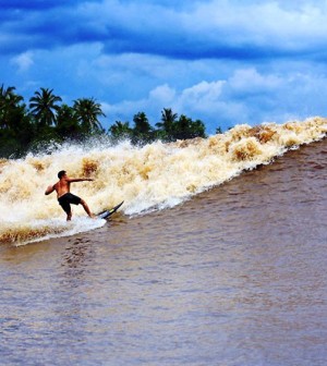 Semua nama-nama tadi tak pernah berhenti mengejar dan menguasai ombak dengan sebilah papan. Amazon? Hawaii? Itu sih biasa. Di tempat-tempat itu, hanya ada sedikit gelombang. Tapi kalau, Sungai Kampar? Asyiknya bisa rame-rame. Bono Tujuh Hantu, gelombang tujuh tingkat yang sudah melegenda, bisa ditaklukkan berjamaah. Itu terjadi lantaran Sungai Kampar bisa menciptakan 21 buah gelombang secara bersamaan. Sehingga jika puncak Bono, 21 surfer bisa berselancar bersamaan.
