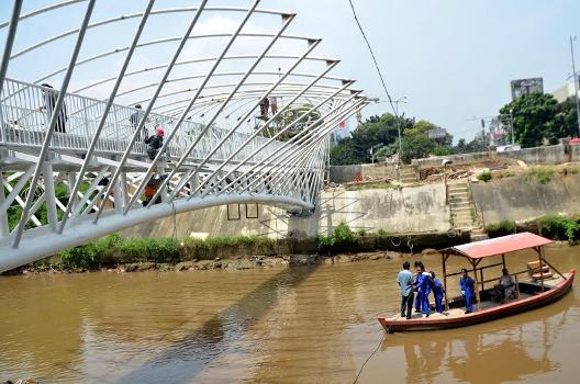 Pekerja menyelesaikan pembangunan Jembatan Penyeberangan Orang (JPO) di atas Sungai Ciliwung di kawasan Manggarai, Jakarta, Jumat (1/4). JPO yang menghubungkan kawasan Menteng Tenggulun dan Manggarai itu dibangun untuk menggantikan transportasi perahu eretan yang selama ini digunakan warga.Putu Wahyu Rama/RM