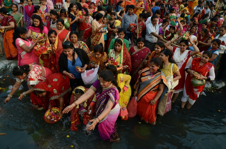 Para wanita Hindu India melakukan ritual selama festival Gangaur di sungai Mahananda di Siliguri. Festival ini merupakan salah satu festival terpenting yang dilakukan untuk menghormati Gauri, istri Dewa Siwa, yang dilaksanakan mulai bulan Maret sampai April.