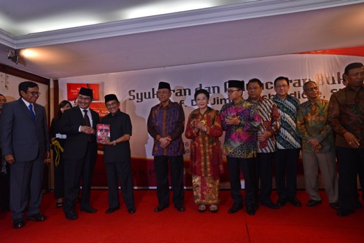 Mantan Ketua Mahkamah Konstitusi (MK), Jimly Asshiddiqie, menyerahkan buku mengenai dirinya kepada Presiden ke-3 RI, B.J. Habibie, saat acara peluncuran dua buku yang sekaligus memperingati hari ulang tahunnya ke-60 di Aula Gedung MK, Jakarta, Sabtu (16/4). Dua buku itu berjudul 60 Tahun Jimly Asshiddiqie: Menurut Para Sahabat dan 60 Tahun Jimly Asshiddiqie: Sosok, Kiprah dan Pemikiran. Tampak dalam foto beberapa tokoh nasional lain yang diundang ke acara itu antara lain Ketua MPR RI Zulkifli Hasan, Ketua DPD RI Irman Gusman dan Ketua Umum Partai Hanura Jenderal (Purn) Wiranto. Putu Wahyu Rama/Rakyat Merdeka