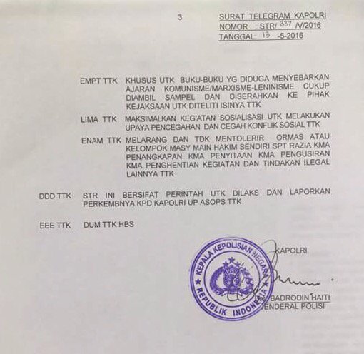 Telegram itu, beredar pada Jumat malam (13/5). Berdasarkan surat perintah bernomor 337/V/2016 itu, Badrodin mengatakan dalam penindakan hukum harus merujuk pada Tap MPRS No XXV/1999 dan UU No 27/1999.