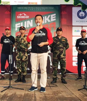 Setelah acara gunting pita sebagai bentuk peresmian Pasar Santri, Menpora didampingi Bupati Pasuruan dan Anggota DPRD Jawa Timur dan Pengasuh Ponpes Sidogiri melepas peserta funbike.
