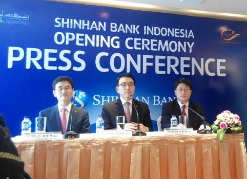 Tiga pimpina Bank Shinhan (kiri ke kanan), Executive Vice President, Heo Young Taeg; President and CEO, Cho Yong Byoung; dan President Director Shinhan Indonesia, Suh Tae Won, saat memberikan keterangan pers terkait opening ceremony cabang Indonesia, di Hotel Indonesia Kempinski, Jakarta Pusat, Senin (16/5). Tangguh Sipria Riang/RMOL