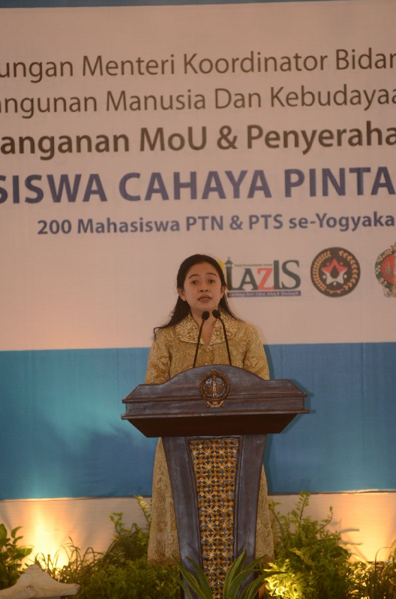 Demikian disampaikan Menteri Koordinator Bidang Pembangunan Manusia dan Kebudayaan (Menko PMK), Puan Maharani, saat menyampaikan sambutan 'Penandatanganan MoU dan Penyerahan Beasiswa Cahaya Pintar' di Bangsal Kepatihan Yogyakarta, Senin (20/6).