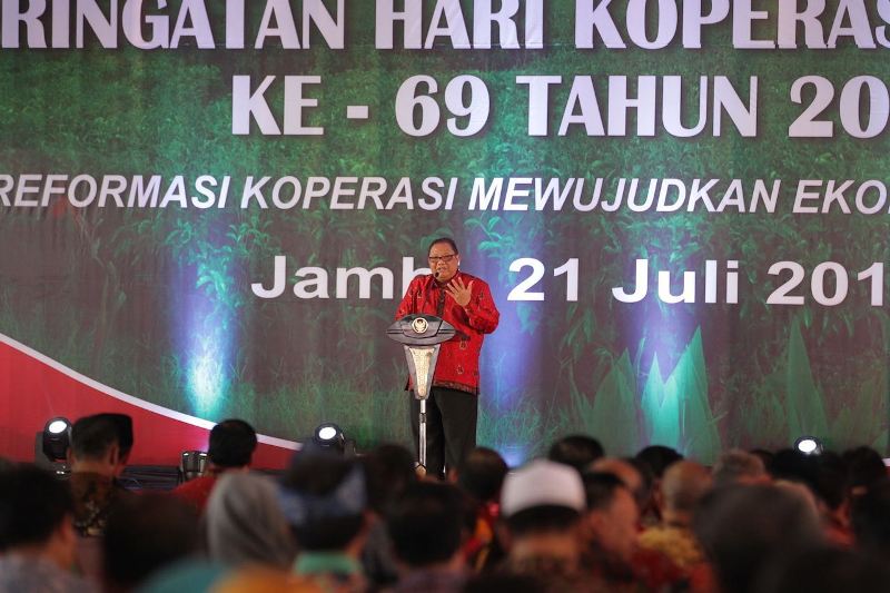 Menteri Koperasi dan UKM AAGN Puspayoga memberikan sambutan dihadapan Presiden RI pada puncak Peringatan Hari Koperasi Nasional ke 69, Kamis (21/7) di Provinsi Jambi. Menteri mengatakan reformasi koperasi total dilakukan melalui tiga langkah, yaitu rehabilitasi, reorientasi dan pengembangan agar menjadikan koperasi mandiri, sehat dan berkualitas. Humas Kemenkop