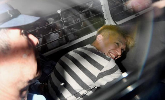 Satoshi Uematsu, pelaku penikaman fasilitas penyandang cacat tampak menyeringai dari dalam mobil polisi saat dipindahkan dari kantor polisi Sagamihara ke kantor kejaksaan pada Rabu (27/7). Dalam penikaman tersebut 19 orang tewas. Reuters