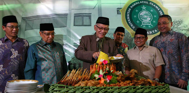 Wakil Rois Aam PBNU Miftahul Ahyar (tengah) memotong nasi tumpeng disaksikan Ketua Umum PBNU Said Aqil SIradj (dua dari kiri), Sekjen PBNU Heli Faisal Zaini (tiga dari kiri), Ketua Umum PKB Muhaimin Iskandar (dua dari kiri), dan Menteri Desa, Pembangunan Daerah Tertinggal dan Transmigrasi (Mendes PDTT), Eko Putro Sandjojo saat peresmian pembangunan Universitas Nahdatul Ulama di Jakarta, Rabu (10/8). Universitas Nahdlatul Ulama (UNU) menggelar peletakan batu pertama. Pembangunan mengusung niatan besar mendirikan Perguruan Tinggi NU yang unggul, tangguh dan humanis. Patrarizki Syahputra/RM