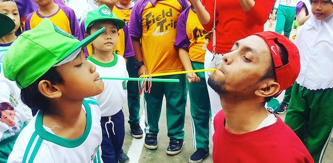 Seorang siswa dan seorang guru SD Laboratorium Jakarta Timur tengah memindahkan karet gelang menggunakan sedotan (straw) dalam perlombaan menyambut HUT ke-71 Kemerdekaan Republik Indonesia, Rabu (24/8). Repro
