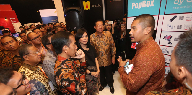 Presiden Jokowi (kiri) mendengarkan penjelasan CEO PT. Dimo Pay Indonesia (DIMO) Brata Rafly saat berkunjung ke booth DIMO dalam acara Indonesia Fintech Festival & Conference 2016 di ICE BSD City, Serpong, baru-baru ini. Randy Tri Kurniawan/RM