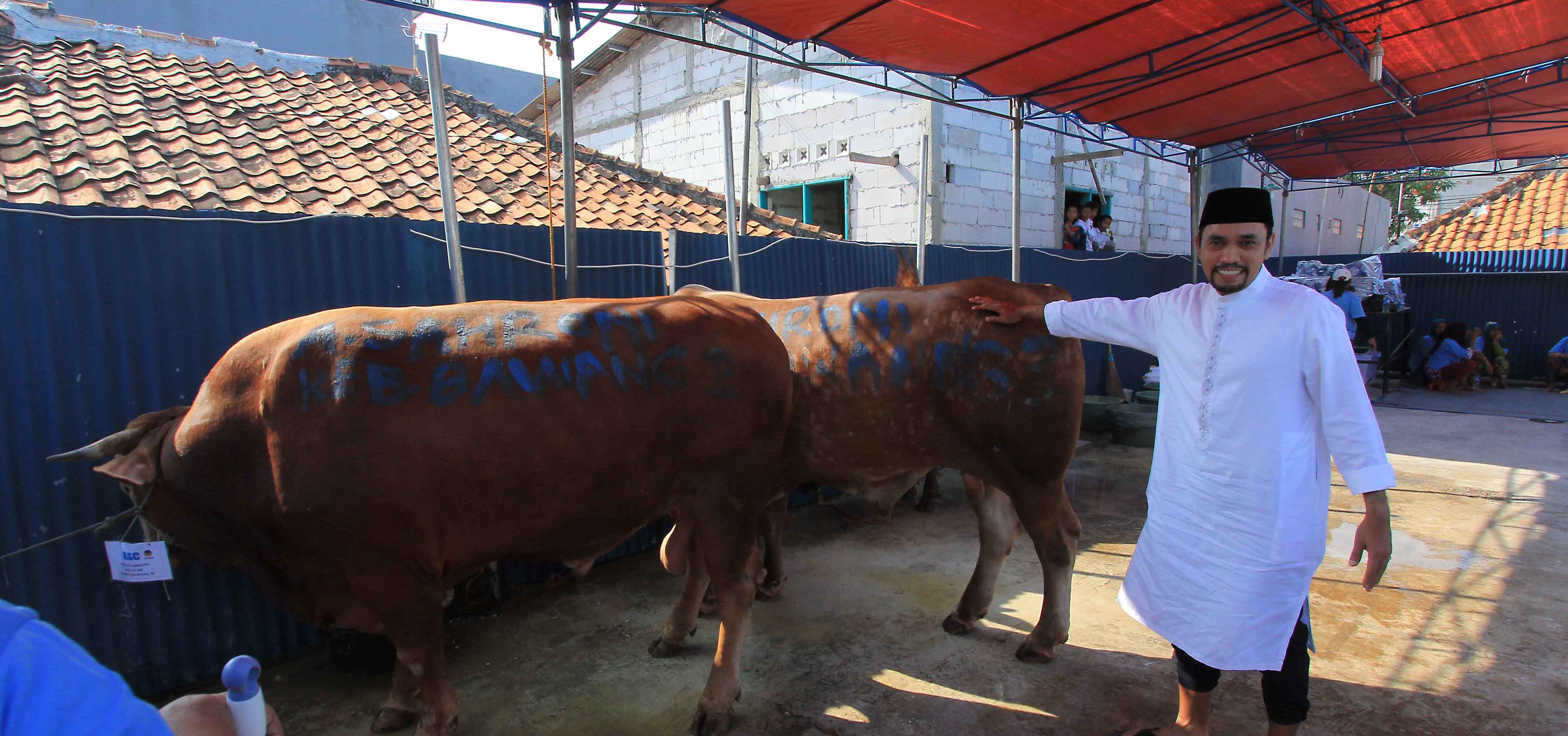 Anggota Komisi III DPR RI Fraksi Partai Nasdem Ahmad Sahroni (berpeci) pertaman kalinya menyembelih sapi saat qurban perayaan Idul Adha 1437 dikediaman Ahmad Sahroni Center (ASC), Kebon Bawang, Jakarta Utara, Senin (12/9/16). Sebanyak 15 sapi qurban dibagikan kepada konstituen dapil dan masyarakat jakarta yang membutuhkan. Dwi Pambudo/Rakyat Merdeka