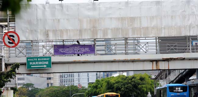 Suasana Jembatan Penyeberangan Orang (JPO) yang dipasang papan iklan di kawasan Hayam Muruk, Jakarta, Kamis (29/9). Pemprov DKI Jakarta akan membuat peraturan gubernur (Pergub) larangan memasang iklan di Jembatan Penyeberangan Orang (JPO). Menyusul robohnya JPO di Pasar Minggu, Jakarta Selatan, Sabtu (24/9) lalu. Putu Wahyu Rama/RM