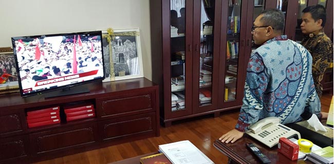 Ketua MPR RI Zulkifli Hasan memantau perkembangan unjuk rasa Gerakan Nasional Pengawal Fatwa (GNPF) Majelis Ulama Indonesoa dari ruang kerjanya di Gedung Nusantara III komplek parlemen, Jakarta. Dia berharap aksi yang diikuti ratusan ribu orang itu terus berjalan damai.