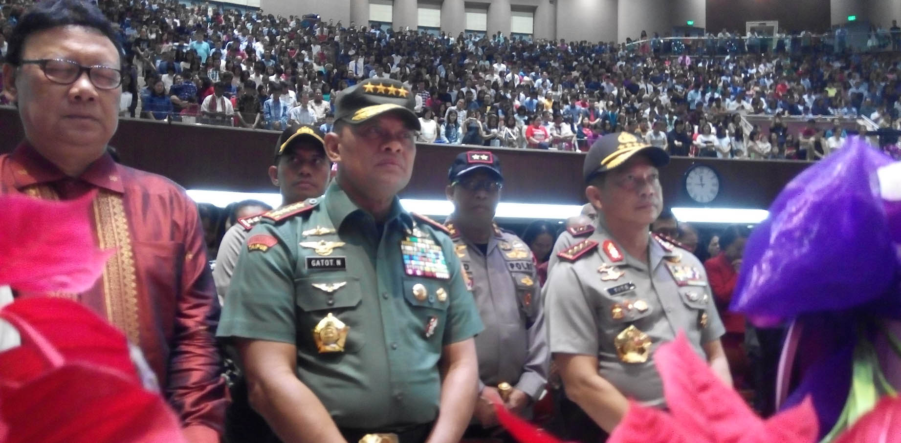 Rombongan Mendagri Tjahjo Kumolo, Kapolri Jenderal Tito Karnavian, Panglima TNI Jenderal Gatot Nurmantyo, dan Plt Gubernur DKI Soni Sumarsono di Gereja Reformed Injili Indonesia, Reformed Millennium Center Indonesia (RMCI), Jl. Industri Blok B-14 No.1, Kemayoran Jakarta Pusat, Sabtu malam (24/12). Ada empat gereja yang ditinjau keempat tokoh itu dalam misa natal 2016 malam ini.