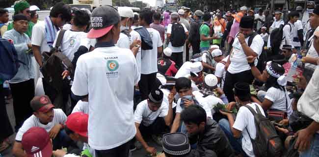 Nampak massa dari Persaudaraan Muslimin Indonesia (Parmusi) makan nasi bungkus di pinggir jalan, Jalan Gajah Mada, Gambir, Jakarta Pusat, Selasa (26/12). Makan nasi bungkus ini sebagai rasa sukacita atas putusan sela majelis hakim Pengadilan Negeri Jakarta Utara. RMOL