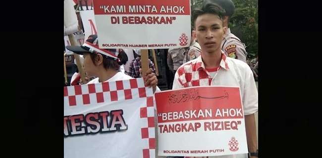Persidangan kasus penistaan agama yang dilakukan Basuki Tjahaja Purnama alias Ahok di Auditorium Kementerian Pertanian di Ragunan, Jakarta (Selasa, 3/12) juga diramaikan oleh massa yang patut diduga hoax. Seperti yang terlihat pada foto di atas, dua orang membawa spanduk berisi dukungan untuk Ahok. Salah seorang di antaranya adalah wanita yang memegang spanduk dari kelompok "Hijaber Merah Putih". Repro
