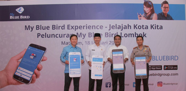 Dari kiri: Direktur PT Blue Bird Tbk. Sigit Priawan bergambar bersama Wakil Wali Kota Mataram Mohan Roliskana, Kadishub Provinsi NTB Lalu Bayu Windya, dan Dirlantas Polda NTB Kombes Budi Indra Dermawan usai peluncuran aplikasi My Blue Bird di Lombok, Rabu (18/1). Aplikasi berbasis online tersebut diluncurkan PT Blue Bird Tbk. untuk memudahkan para penumpang mencari taksi yang mudah, aman dan nyaman. Serta dalam rangka mendukung sektor pariwisata di Lombok.