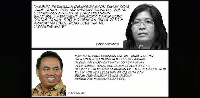 Sebuah meme yang memperlihatkan pertempuran data antara pendukung Basuki Tjahaja Purnama alias Ahok dengan Pemprov DKI Jakarta mengenai pembangunan Masjid Al Fauz di Jakarta Pusat. Kubu pendukung Ahok membandingkan pembangunan masjid di masa Sylviana Murni menjabat sebagai Walikota Jakarta Pusat dengan pembangunan masjid Fatahillah oleh Ahok. Sementara Sekda Pemprov DKI Saefullah memberikan penjelasan yang jauh lebih detail dan terperinci, serta lebih akurat. Repro