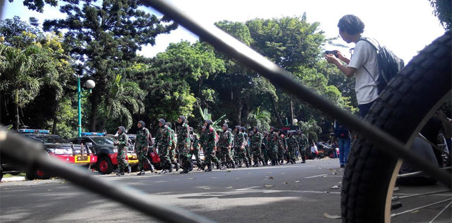 Puluhan Korps Wanita TNI Angkatan Darat (Kowad) berhijab ikut disiagakan untuk mengamankan demo FPI dan GNPF-MUI di depan Polda Metro Jaya, Senin (23/1).