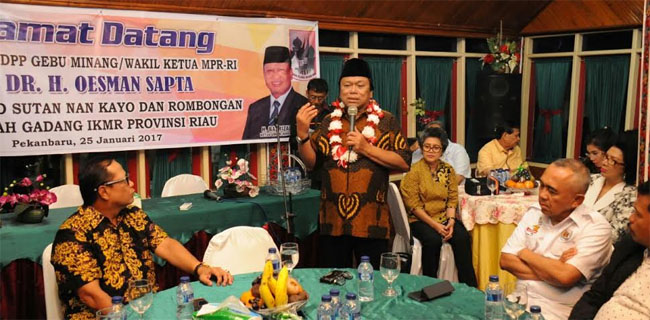 Begitu kata Ketua Umum Gebu Minang dalam pertemuan dengan Ikatan Keluarga Minang Riau (IKMR) di Rumah Gadang IKMR Provinsi Riau, di Pekanbaru Riau, Rabu (25/1). Pertemuan dihadiri Gubernur Riau Arsyadjuliandi Rachman, Ketua Umum IKMR Basrizal Koto, dan Ninik Mamak Minang Riau.