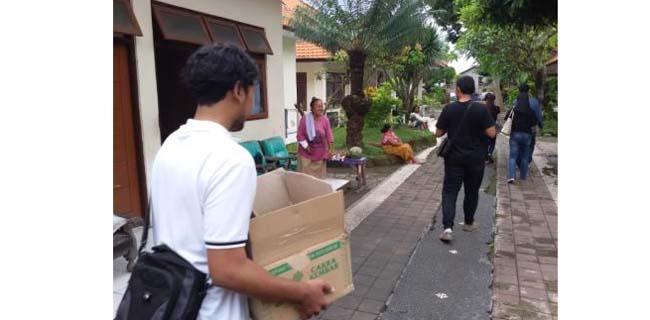 Anggota Komunitas Ketimbang Ngemis Bali membagikan bingkisan sarapan bubur ayam dan bubur kacang hijau dari satu kamar ke kamar lainnya panti. Dalam satu pondok biasanya terdiri dari enam orang lansia. Rata-rata usia lansia disini berkisar dari usia 60 hingga 90 tahun.