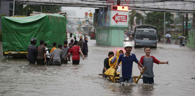 Banjir merendam ruas Jalan Gunung Sahari, Jakarta Pusat, Selasa (21/2). Intensitas curah hujan tinggi sejak dini hari tadi membuat sebagian wilayah ibukota tergenang banjir dengan tinggi variasi 40-150 centimeter. Putu Wahyu Rama/RM
