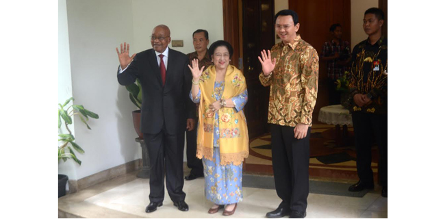 Presiden Afrika Selatan, Jacob Zuma, mengunjungi kediaman pribadi Presiden ke-5 RI, Megawati Soekarnoputri, di Jalan Teuku Umar, Jakarta, Rabu (8/3). Calon Gubernur DKI Jakarta, Basuki Purnama alias Ahok, turut dalam pertemuan itu. Salah satu tema pembicaraan Zuma dan Mega adalah sejarah Presiden Pertama RI, Soekarno, yang merupakan ayah kandung Mega. Pada zamannya, Soekarno dikenal memiliki hubungan sangat baik dengan Afrika Selatan. Mereka juga membicarakan hubungan bilateral dua partai yang mereka pimpin. Selama di Jakarta, Zuma menjadi tamu resmi dari agenda Indian Ocean Rim Association (IORA) Summit. Putu Wahyu Rama/Rakyat Merdeka