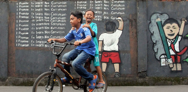 Mural anti korupsi menghiasi tembok bangunan di ruas jalan salah satu kampung di Jakarta, Senin (13/3). Mural ini merupakan bentuk ajakan agar nilai-nilai dan budaya anti korupsi tertanam pada generasai muda, sekaligus juga bentuk protes terhadap prilaku para pejabat mulai dari dewan perwakilan, penyelenggara negara hingga para penegak hukum, semua terlibat dan menikmati uang korupsi, sehingga menghancurkan sistem perekonomian, sistem demokrasi, sistem politik, sistem hukum, sistem pemerintahan, tatanan sosial dan membuat kehidupan rakyat sengsara. Tedy Kroen/RM