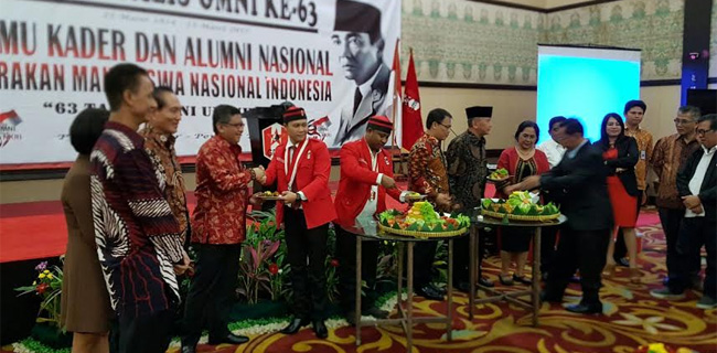 Tumpengan GMNI: Rangkaian puncak kegiatan Dies Natalies ke- 63, Gerakan Mahasiswa Nasional Indonesia (GMNI) berlangsung semarak dihadiri temu alumni di Hotel Cempaka, Kamis (23/3) malam. Nampak, Ketua Presidium GMNI Chrisman Damanik tengah menyerahkan potongan tumpeng pada tokoh senior Hasto Kristiyanto yang juga Sekjen PDI Perjuangan.