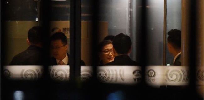 Diplomat Korea Utara dan China terlihat di Bandara Kapital Beijing, saat menunggu kedatangan jenazah pria Korea Utara yang tewas di Malaysia, pertengahan Februari lalu, Jumat dinihari (31/3). BBC