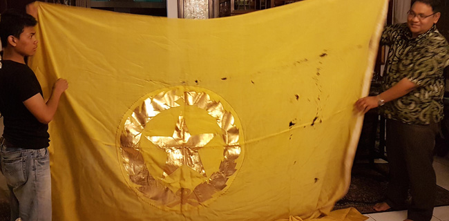 Wakil Rektor Universitas Bung Karno (UBK), Teguh Santosa (kanan), memperlihatkan bendera kepresidenan di era Bung Karno, di kediaman putri Bung Karno, Rachmawati Soekarnoputri, Selasa (11/4). Bendera ini dikibarkan manakala Presiden Soekarno berada di Istana. Bendera ini akan dipamerkan dalam peresmian gedung baru UBK, Jalan Kimia, Jakarta, yang direncanakan berlangsung hari Kamis (13/4). RMOL