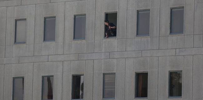 Seorang polisi mengeluarkan sebagian tubuhnya dari jendela di Gedung Parlemen Iran pada hari ini (Rabu, 7/6) di Teheran. Petugas polisi melakukan pengamanan di dalam gedung parlemen setelah serangan sejumlah pria bersenjata yang menewaskan sejumlah orang. Reuters