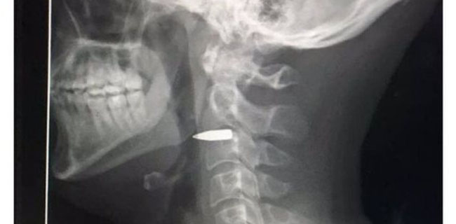 "Untungnya itu melewati segala sesuatu yang penting dan baru saja tersangkut di balik rahang saya," katanya.