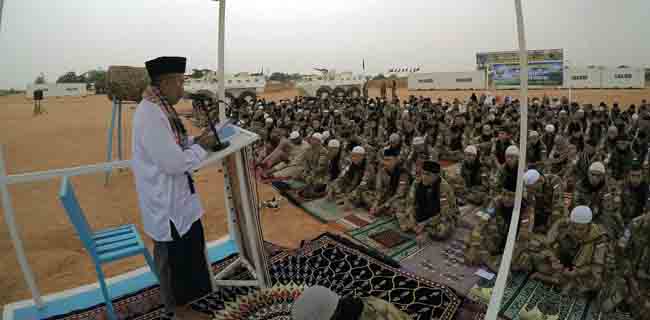 Pasukan Garuda Satgas Indonesian Battalion (Indobatt-03) Batalyon Komposit TNI Konga XXXV-C/Unamid (United Nations Mission In Darfur) menggelar Sholat Idul Fitri 1 Syawal 1438 H, bertempat di Lapangan Apel Indobatt-03, Super Camp, El-Geneina, Sudan, Afrika Utara, Minggu (25/6).